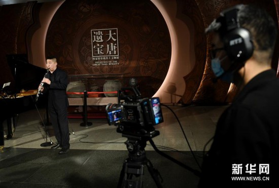 4月14日,西安交响乐团的十余位演奏家在陕西历史博物馆大唐遗宝展厅为即将于4月18日举行的首场“云上国宝”音乐会进行彩排,这是西安交响乐团单簧管首席田天添(左)在进行排练。 新华社记者李一博摄