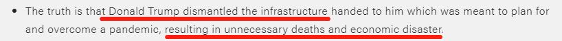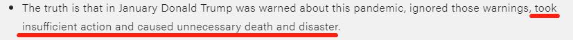 今年1月,特朗普就接到有关疫情的警告,他无视这些警告,没有采取有效行动,造成了不必要的死亡和灾难。