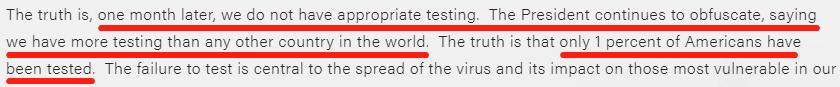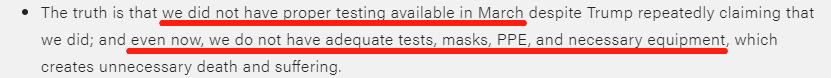 我们在3月份没有完成必要的检测,尽管特朗普反复声称有;甚至现在,我们也没有足够的检测、口罩、个人防护用品和必要的设备,这造成了不必要的死亡和痛苦。