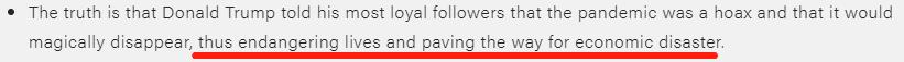 特朗普告诉他最忠实的追随者,大流行是个骗局,它会神奇地消失,但结果导致疫情危及生命,为经济灾难铺平道路。