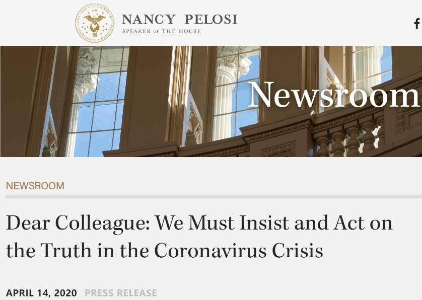 当地时间4月14日,美国众议院官网刊登了一篇题为“亲爱的同事们:在新冠肺炎疫情危机前我们必须坚守真相,立即行动”的公开信。