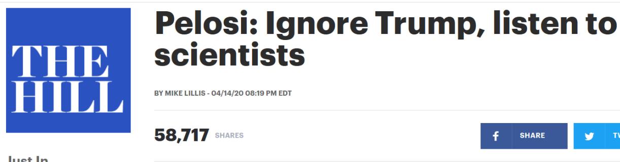 △美国《国会山报》报道佩洛西发表的相关文章:请忽略特朗普,多听听科学家的意见