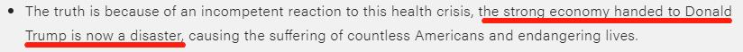 由于对这场危机应对无能,原本强劲的经济在交给特朗普后,变成了一场灾难,给无数美国人带来痛苦,并危及美国人的生命。