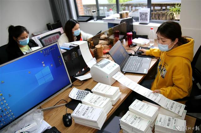 2020年4月14日,在湖北省十堰市郧阳区电商服务中心,工作人员在打印网上订单。