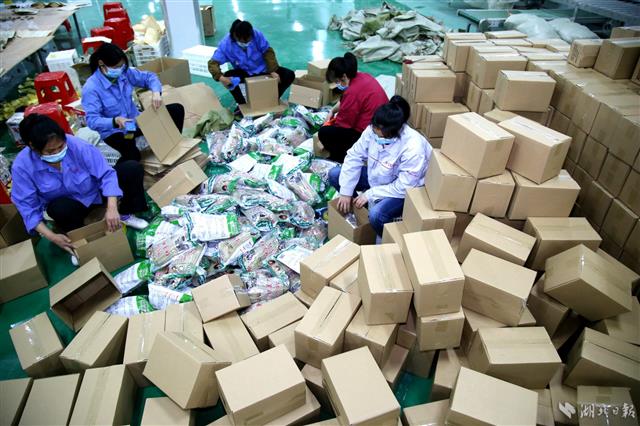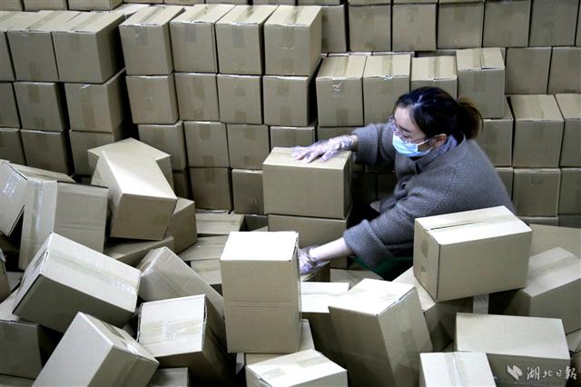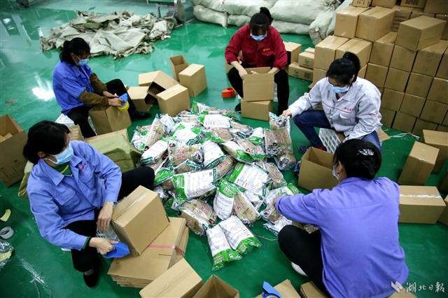 2020年4月14日,在湖北省十堰市郧阳区电商服务中心,工人在包装农产品。湖北省十堰市郧阳区电商服务中心自复工以来,在做好疫情防控的同时,加速与当地农产品加工企业对接销售农产品,及时通过物流将农产品发送到全国各地。据统计,该中心自复工以来线上销售农产品达245万元。 (视界网曹忠宏摄)
