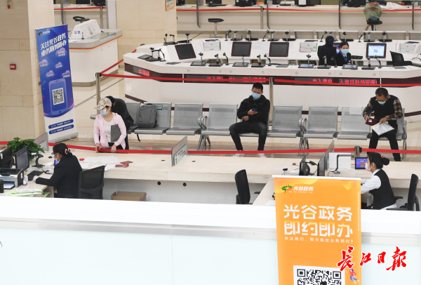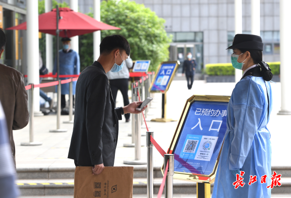 长江网4月17日讯 东湖高新区政务服务中心有序恢复开放,4月17日早上,光谷政务服务大厅外预约咨询区的工作人员已经开始为前来办事的市民耐心做预约帮助,市民在微信公众号“光谷政务”上完成“在线预约”,凭预约界面扫健康码、测量体温后有序进入服务大厅取号办理事务。大厅内设立了等候专座和服务台“一米线”安全距离,自助终端操作也要求距离1.5米。目前所有业务实行预约办理,其中329项业务可“网上办”。(记者高勇 通讯员王昕 摄影报道)