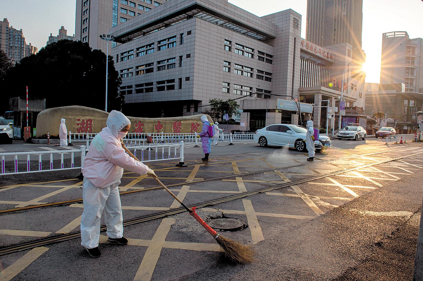 2月4日,湖北省中医院门口,环卫工人对道路进行清洗和消毒。 (湖北日报全媒记者 蔡俊 摄)