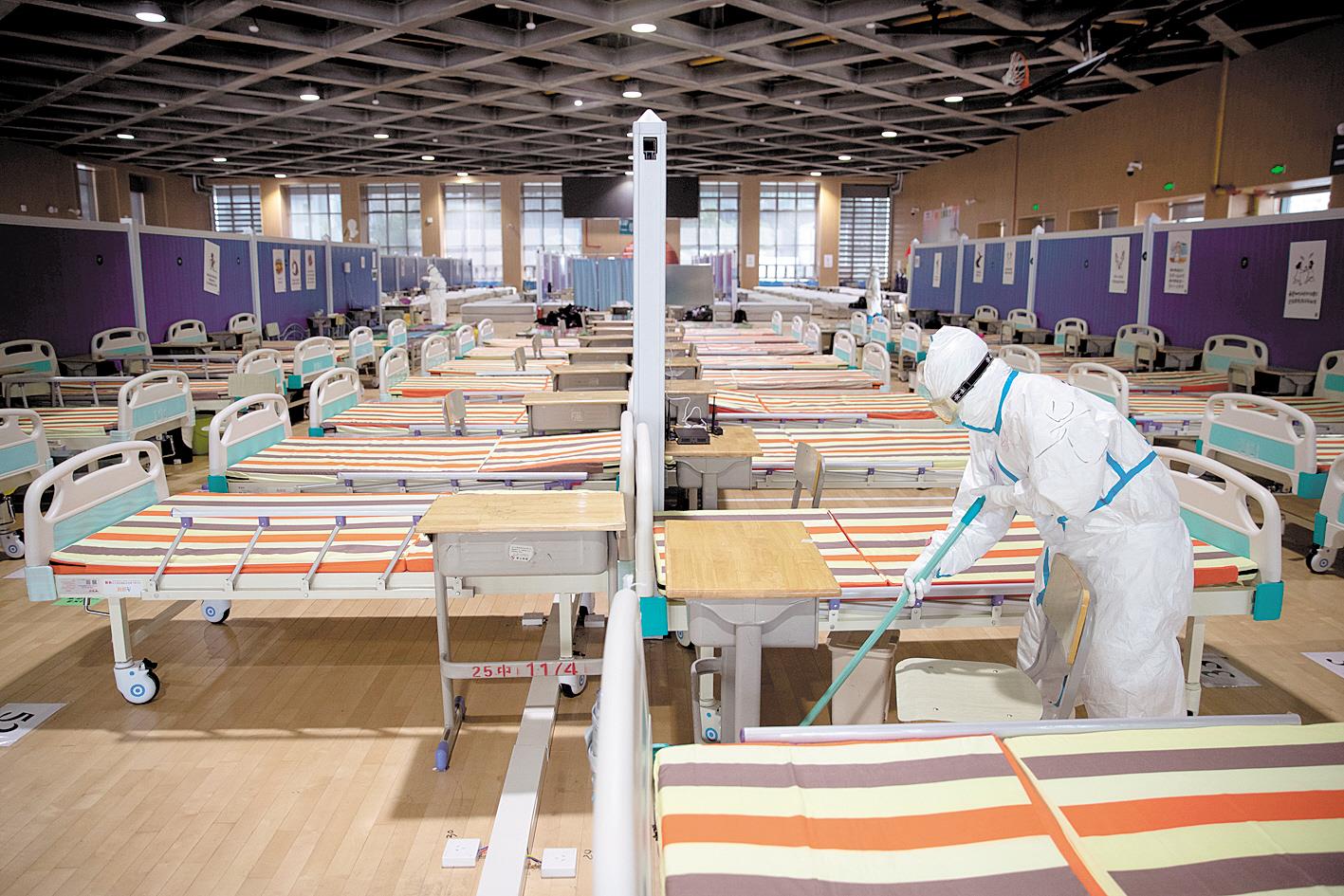 2月4日,武汉国际会展中心内,数百名环卫工人奋战在方舱医院建设一线,分秒必争,整理床铺和被褥。 (湖北日报全媒记者 李溪 摄)