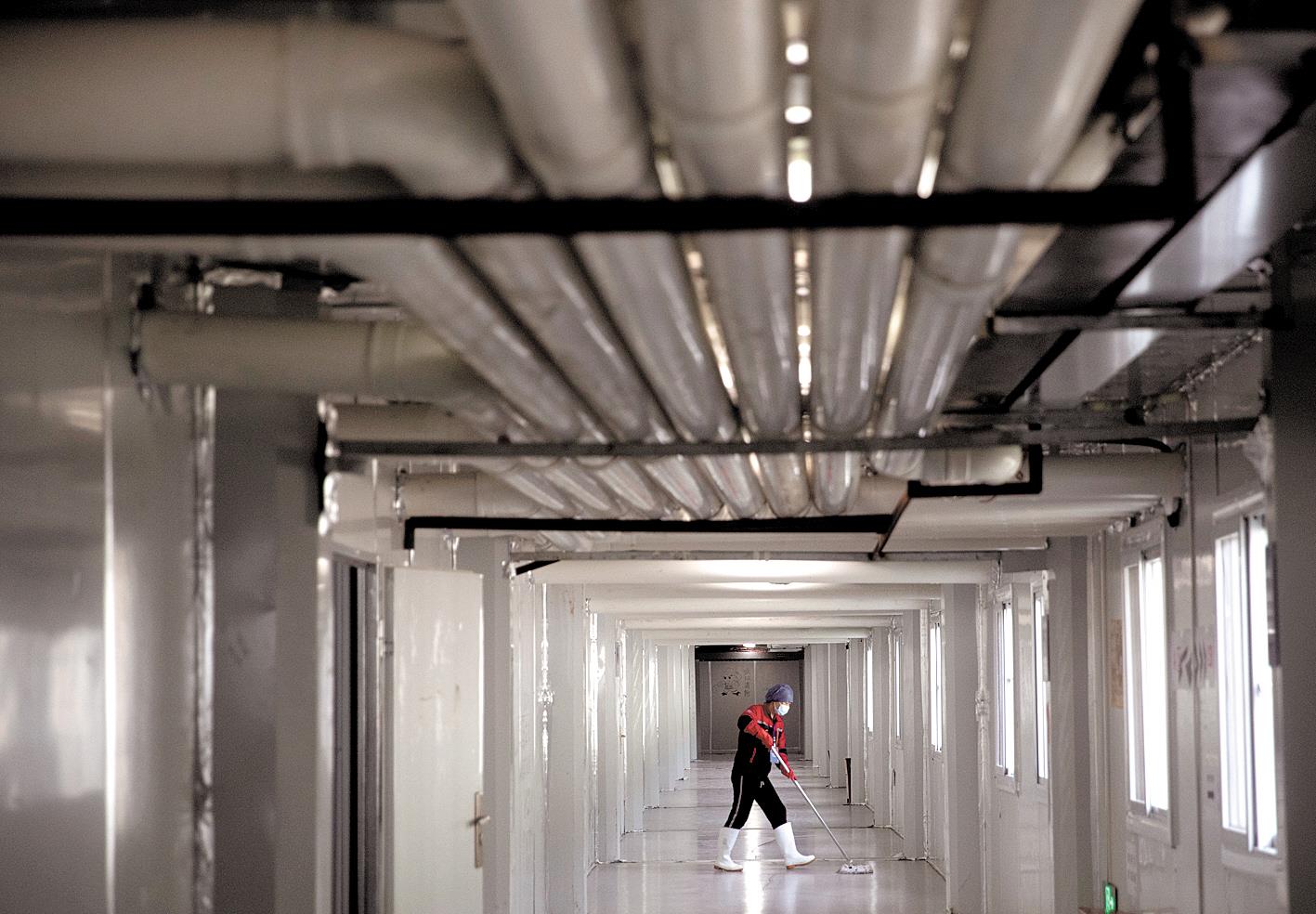 4月14日,雷神山医院,环卫工人在做清洁。 (湖北日报全媒记者 柯皓 摄)