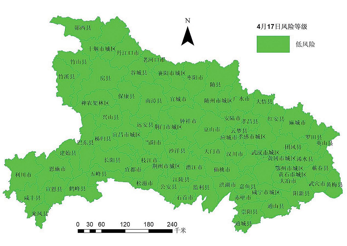湖北省市县风险等级地图。自2月29日发布以来,该地图首次转为全绿。