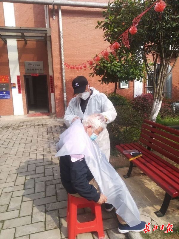 小区老人们说,他们的头发长了没地方剪,杨经理捡起30年前在部队学的理发手艺,免费为小区15名65岁以上老人理发。