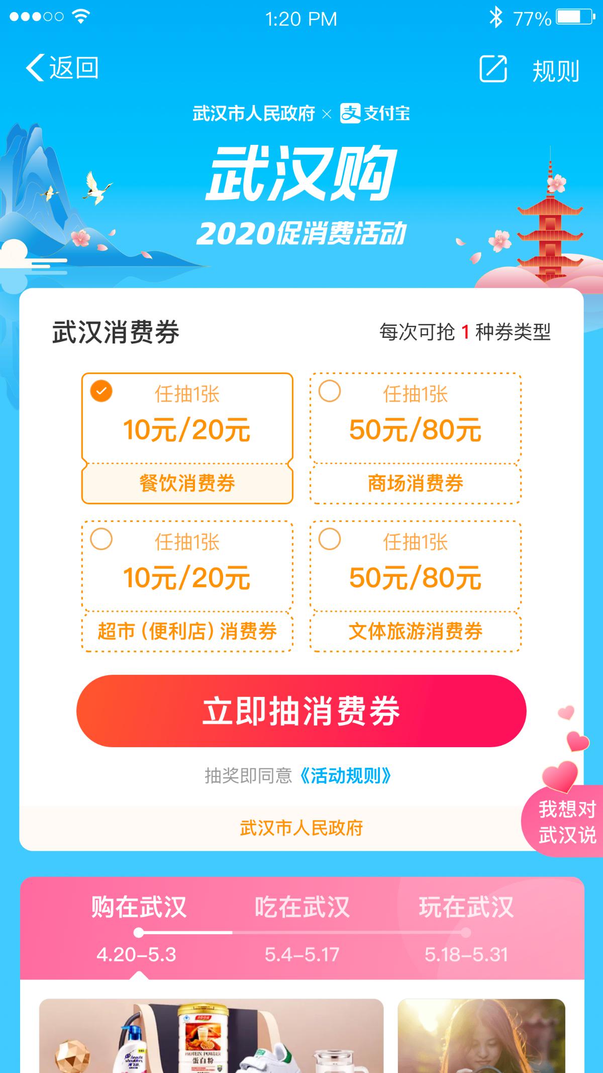 A. 武汉消费者可以从支付宝首页,或者在支付宝搜索“武汉”进入领券页面。消费者进入领券页面,在4类行业消费券里选择其中1类领取,先到先得。