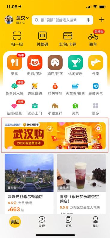方法四:打开美团APP、大众点评APP进入首页搜索“武汉消费券”进入领券页面(4月19日中午12:00开始抢券,从4月30日开始,抢券时间固定为每周四中午12:00)▲