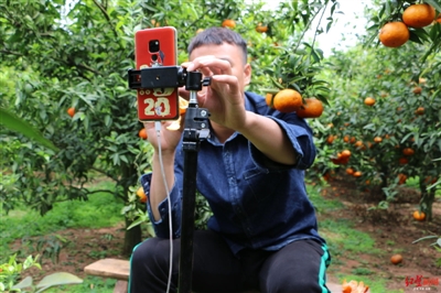 肖钦仁在自家橘子地里作直播 刘成梦 摄