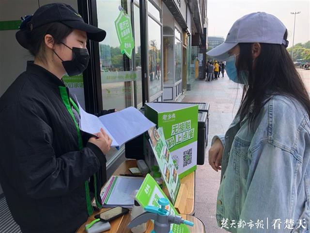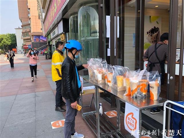 4月19日下午,记者来到位于东西湖吴家山的东西湖中心广场看到,广场上临街门面多数已经复工复产,恢复营业。一些快餐连锁店门口,允许点餐,只是不能堂食,有一些外卖小哥在等候取餐。在一家老乡鸡门店前,外卖小哥取餐之前,服务员还会对他们一一测量体温、查看绿码,外卖上还会贴上安全封条和温度卡,确保消费者用餐安全。