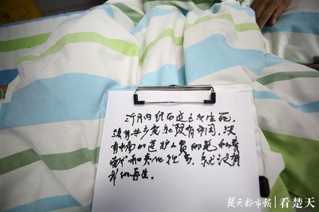楚天都市报4月20日讯(记者陈凌燕 通讯员李晗)武汉雷神山医院4月15日正式“休舱”,最后的4名危重症患者新冠肺炎病毒检测全部转阴,但因严重的并发症和基础疾病,被转入武汉大学中南医院ICU继续救治。4月20日传来好消息,其中一名六旬患者已经脱离生命危险,意识清醒,他用纸笔写下内容简短却情真意切的一封信,向医护人员表示感谢。