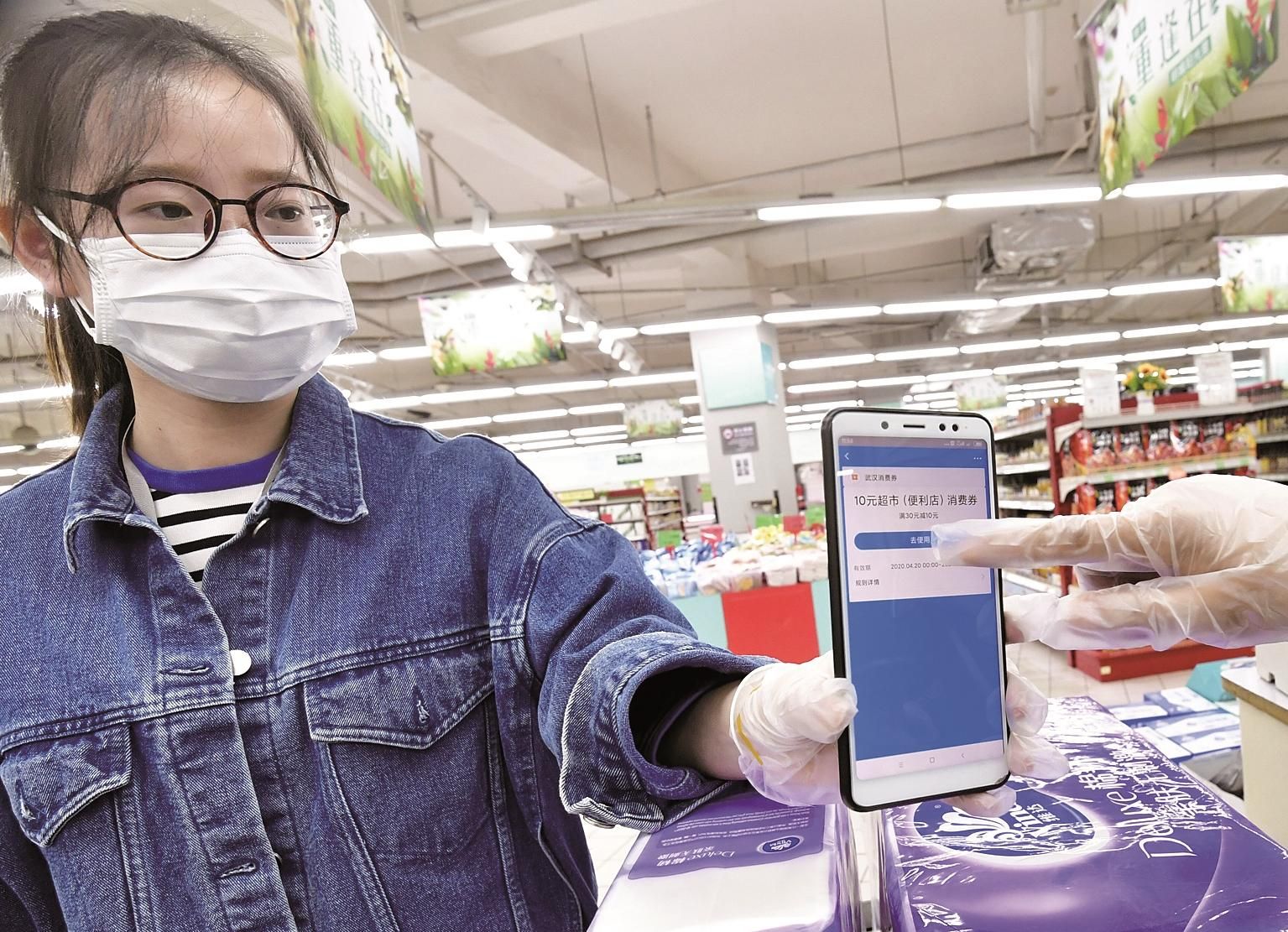 “牛奶,盒马有一张5元的优惠劵,周黑鸭有一个30元减10元的优惠劵,然后水果有一个优惠5元钱的券,加上政府优惠券,我这边大概总共优惠了40元钱,优惠了近三成,非常划算。”20日,市民庞晶在盒马上完成了武汉消费券初体验。