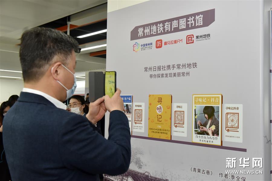 4月21日,乘客在地铁常州北站站台扫二维码收听“有声图书馆”。新华社发(胡平 摄)