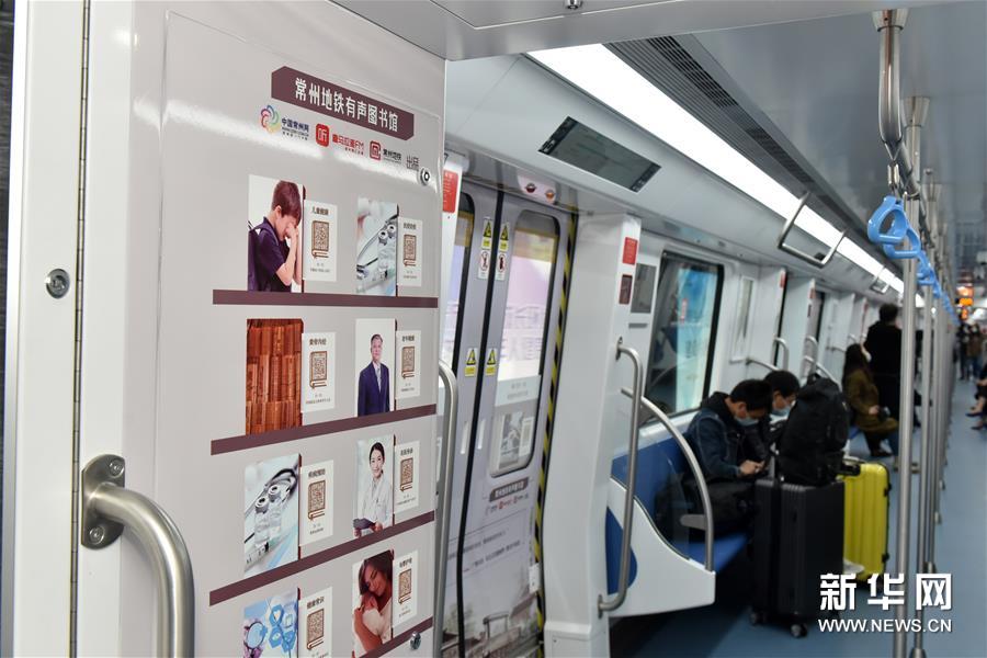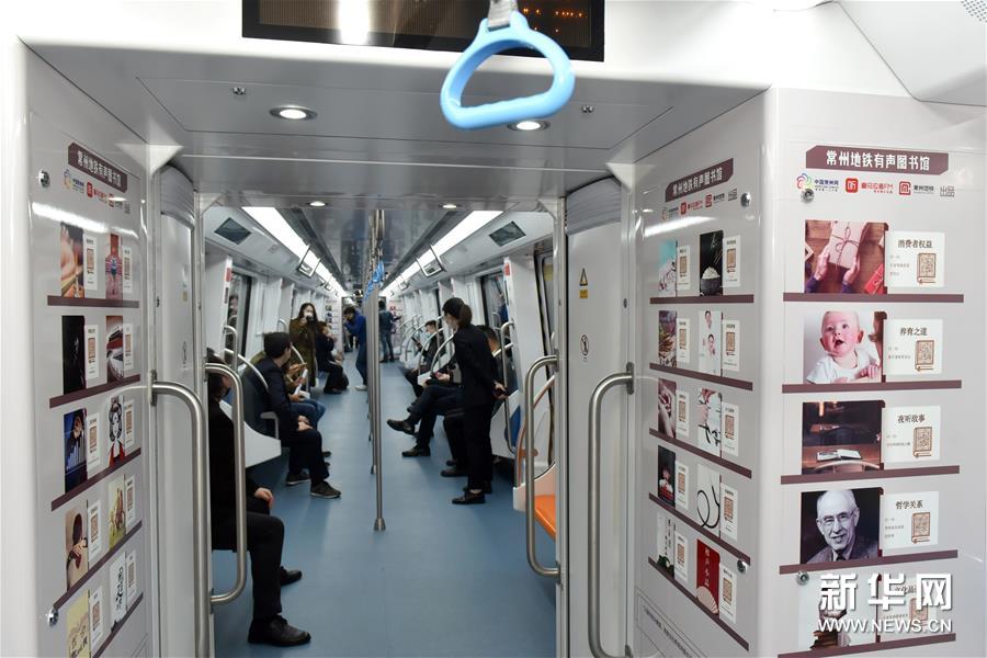 4月21日,乘客乘坐“书香常州号”地铁专列。新华社发(胡平 摄)
