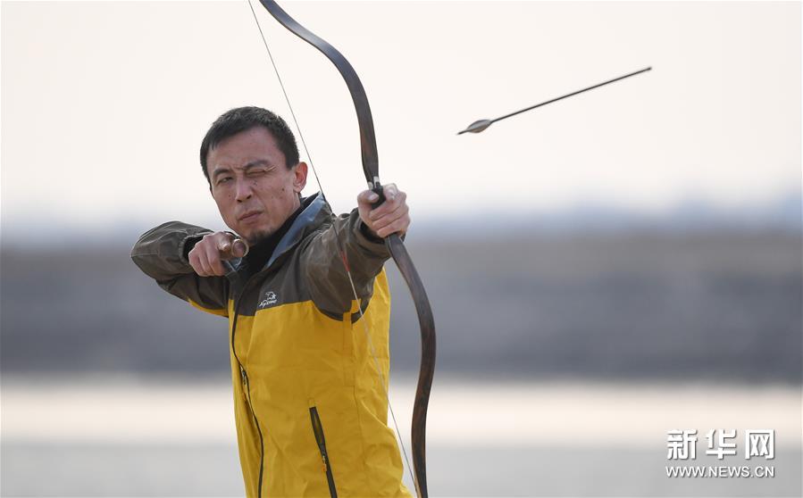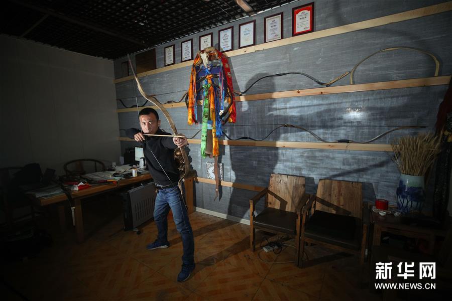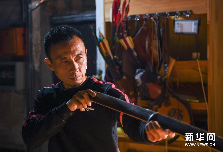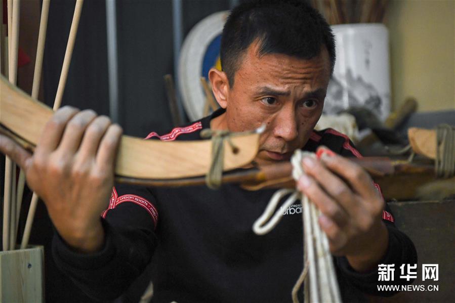 鄂建烨在测试一张弓的拉感(2019年10月28日摄)。新华社记者 龙雷 摄