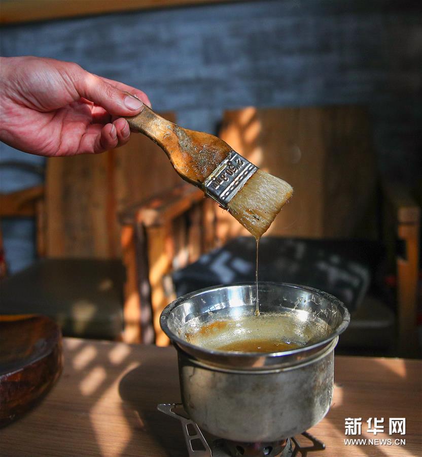 4月20日,鄂建烨在熬制制弓需要的鱼鳔胶。新华社记者 龙雷 摄