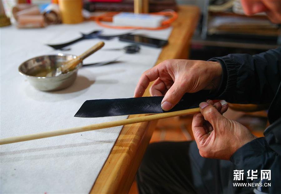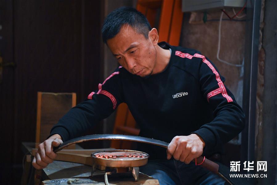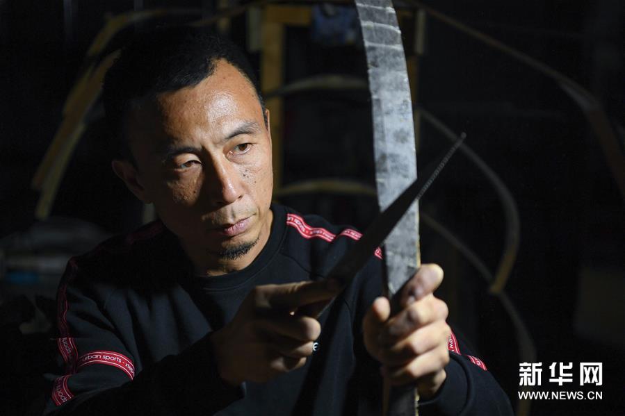 鄂建烨在打磨弓胎(2019年10月19日摄)。新华社记者 龙雷 摄