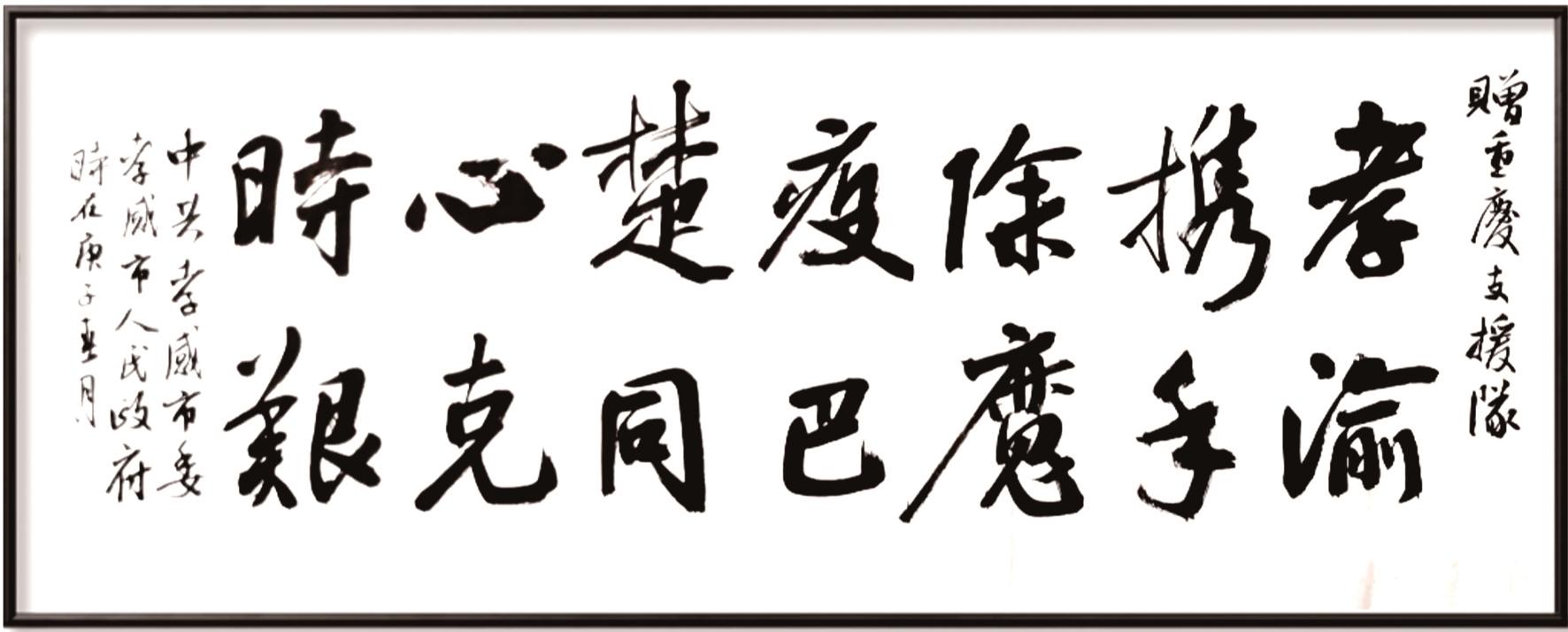 “孝渝携手除魔疫,巴楚同心克时艰”,3月23日,当重庆市对口支援湖北省孝感市的669名医疗队队员踏上返程之路时,孝感市市长吴海涛将这幅饱含感恩之情的书法作品,送到了重庆援鄂医疗队队员手中。