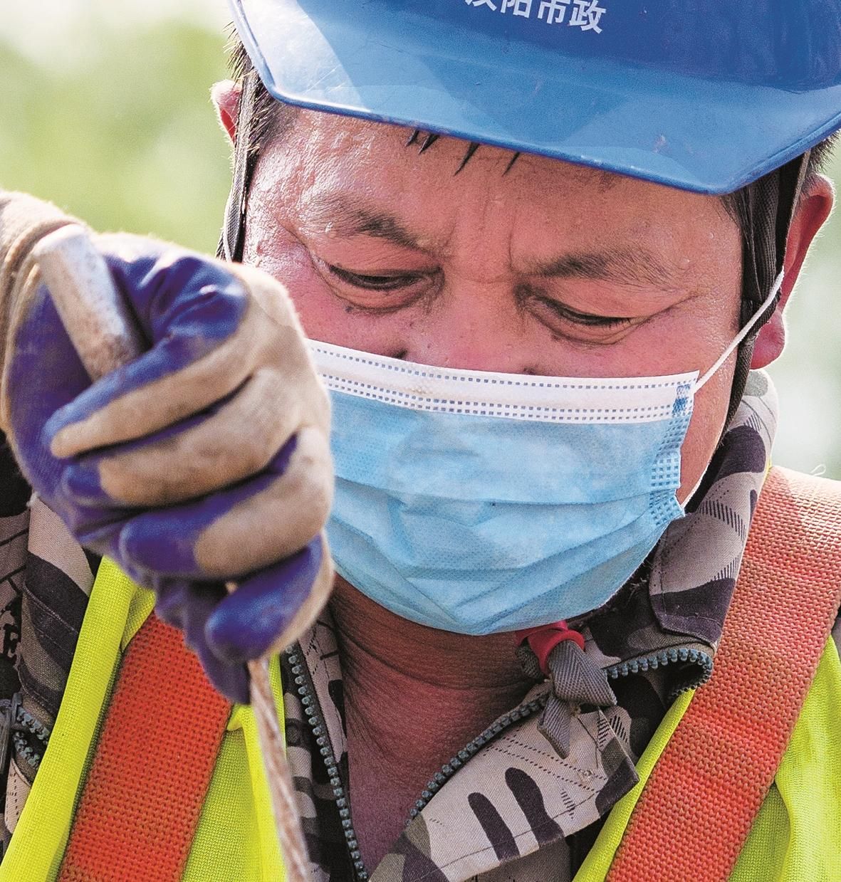 再往下游眺望,预计年底通车的青山长江大桥,已是亭亭玉立。戴着口罩施工的工人们,下工后依次间隔排队领取盒饭,将日常防疫落到每一个细节。