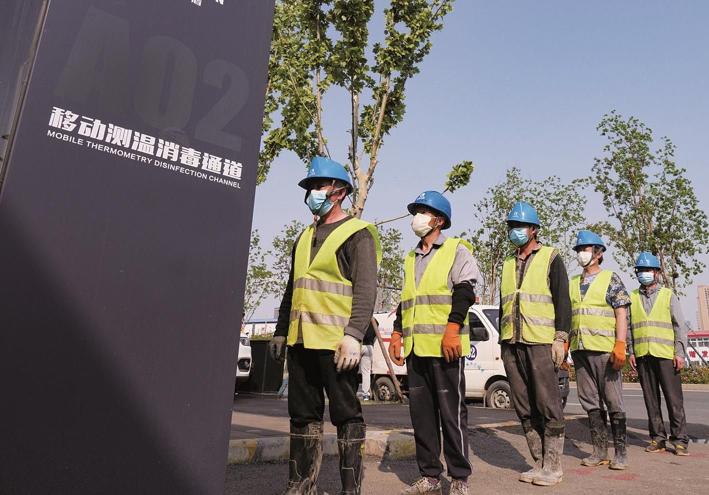 许多工地都配备了移动测温、消毒设备