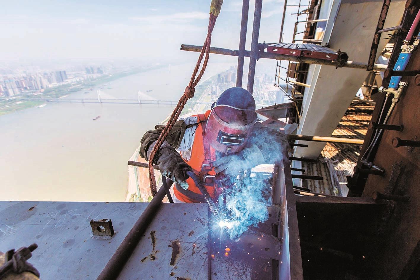 以武汉绿地中心为代表的房建工地上,塔吊安稳摆臂,用闪烁的焊花舞出新风貌;