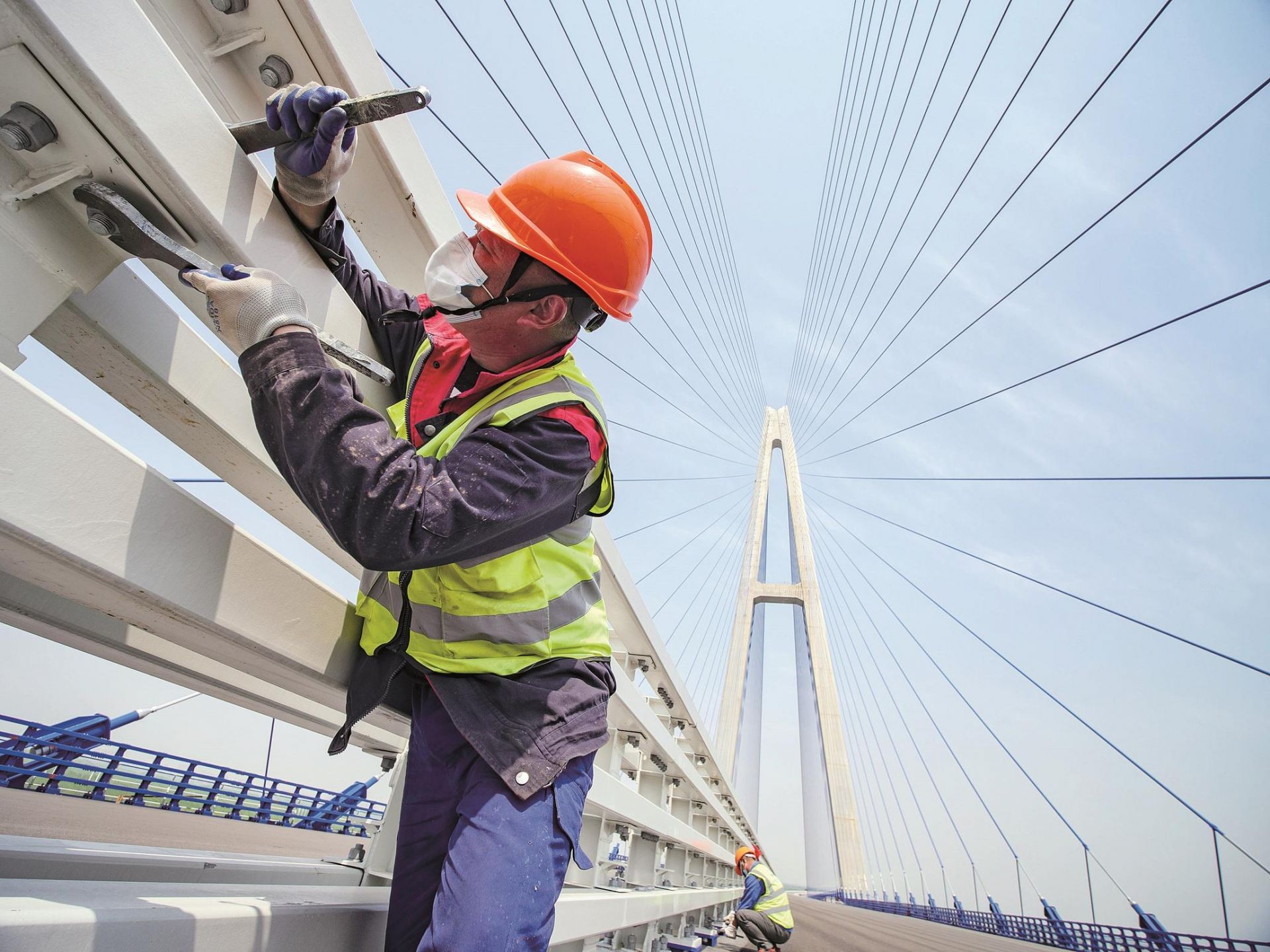 4月19日,预计年底通车的青山长江大桥上,工人对护栏进行线性校准 楚天都市报记者宋枕涛摄