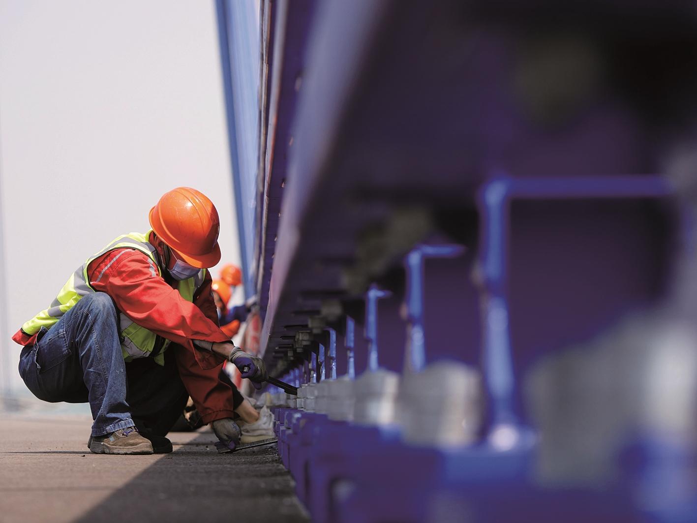 工人对青山长江大桥边护栏进行线性校准