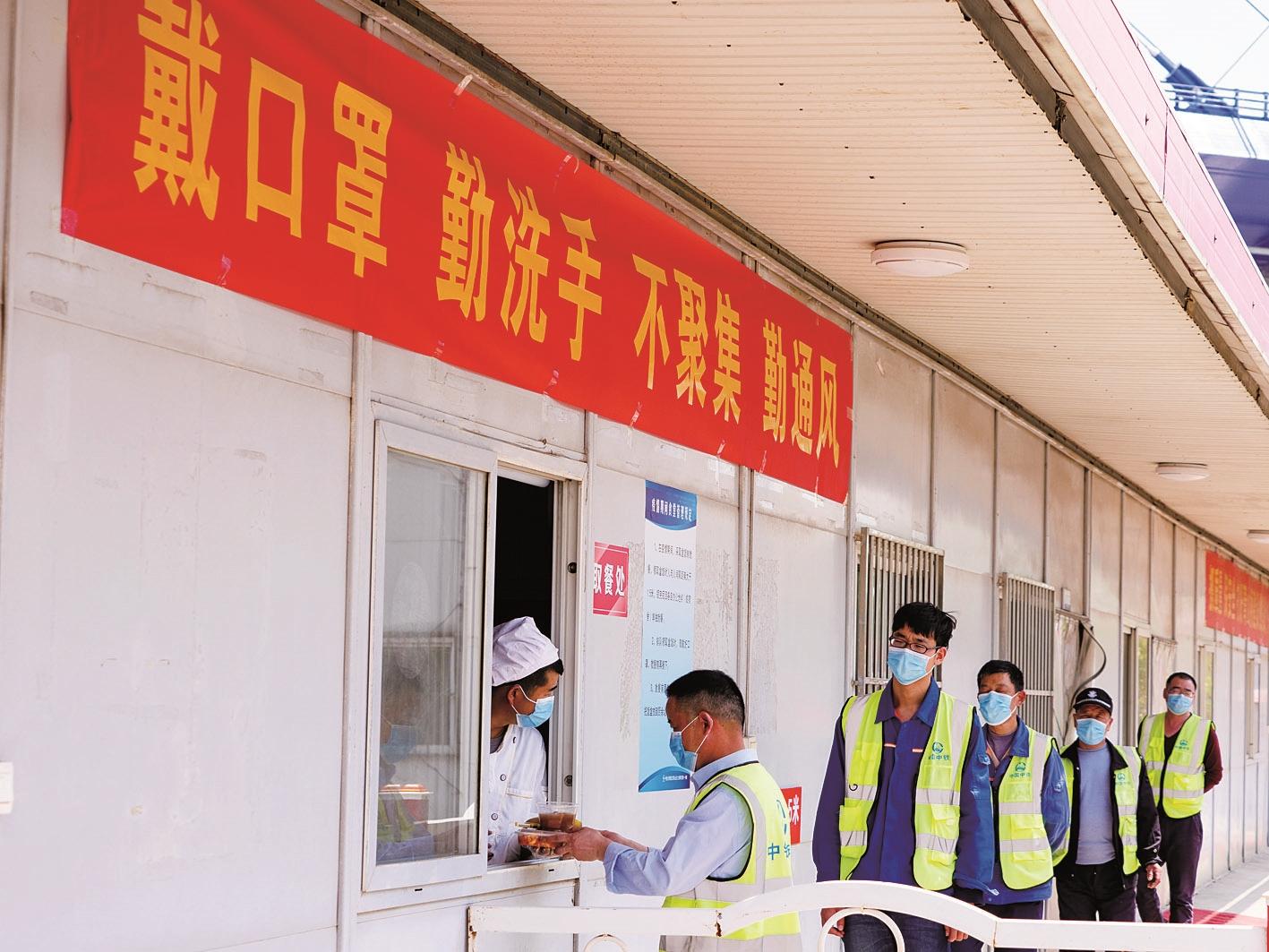 中铁大桥局青山长江大桥项目部,工人在食堂外间隔领取盒饭