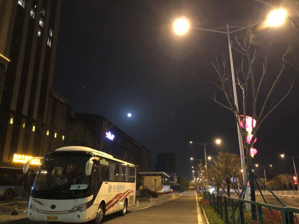 释义:黄昏时走出酒店,空空的路上安安静静,天渐渐黑了,路灯亮了,也看不到一个人影。抬头看到空中的明月,她应该是最了解人间的悲欢离合,一切都是那么顺其自然。