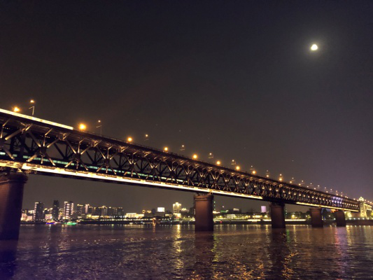 释义:夜里乘舟在长江之上,长江南岸上有金色的黄鹤楼和十七的满月。江心之水暗如墨,只能游赏四周的灯光美景。船头红色的鹦鹉洲长江大桥亮起了长串的珠链式的灯光,江北不时飘来阵阵槐花香,原来已经是人间四月了。