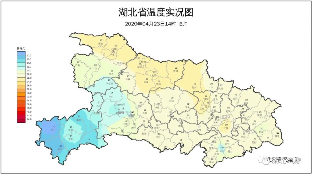 但气温已在稳步回升中......23日下午14点省内大部气温除鄂西南在15℃上下外其他地区都升至21℃左右鄂西地区、江汉平原较22日的同一时次都有2-4℃的上涨