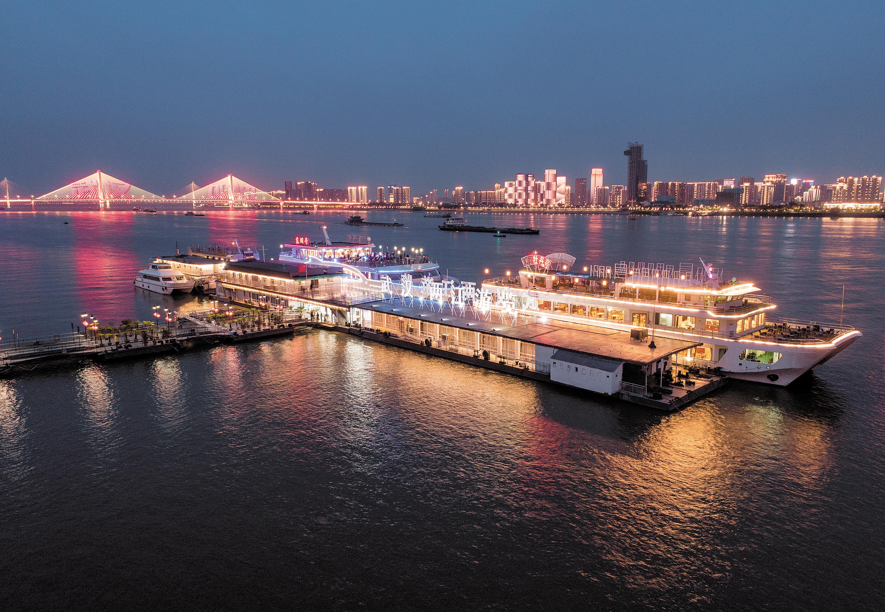 4月25日晚,武汉长江粤汉码头,“东湖号”和“牡丹号”游船先后驶离码头开始试运营。据悉,在严格落实疫情防控措施的前提下,经政府有关部门批准,武汉两江游览游船当日正式复航,开始试运营。 (湖北日报全媒记者 魏铼 摄)