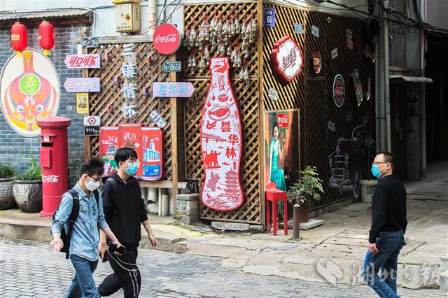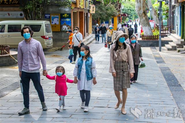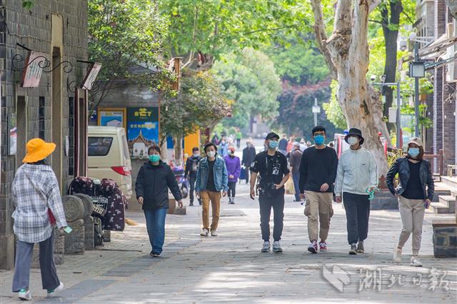 4月25日,正值周末,阳光明媚,市民游客在昙华林老街上休闲游玩。4月20日,武汉文化旅游地标——昙华林历史文化街区核心区恢复开放。25日记者看到,前来昙华林游玩的市民游客并不多,部分小店开门营业,人气有待慢慢恢复。根据文旅部、国家卫健委相关通知要求,疫情防控期间,非遗馆、汉绣馆等室内场馆暂不开放,街区每天接待游客量不超过最大承载量的30%,即每天最多接待1500名游客。(湖北日报全媒记者 梅涛 摄)