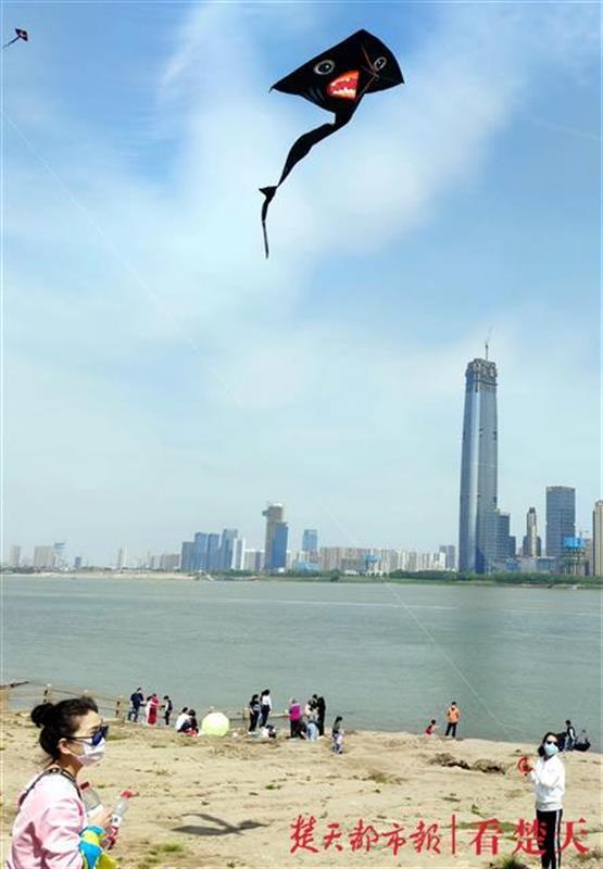 在汉口江滩公园,不少小朋友手执线轴,迎风奔跑,蔚蓝的天空中飞舞着各式各样的风筝,它们颤颤悠悠,互比高低,都在向着蓝天,向着白云,展翅飞翔。