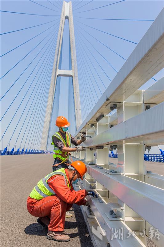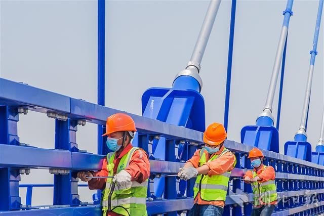 4月26日,中铁大桥局施工人员正在对大桥护栏进行矫正。
