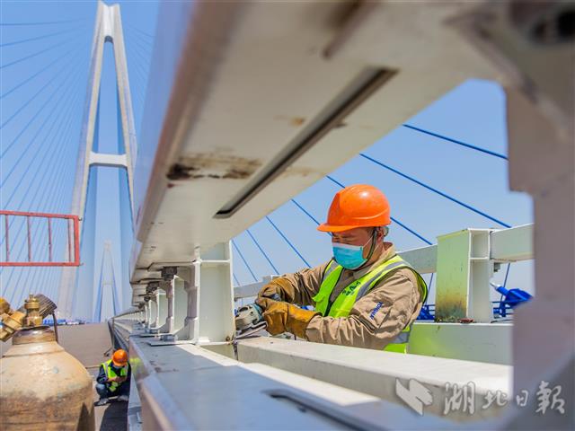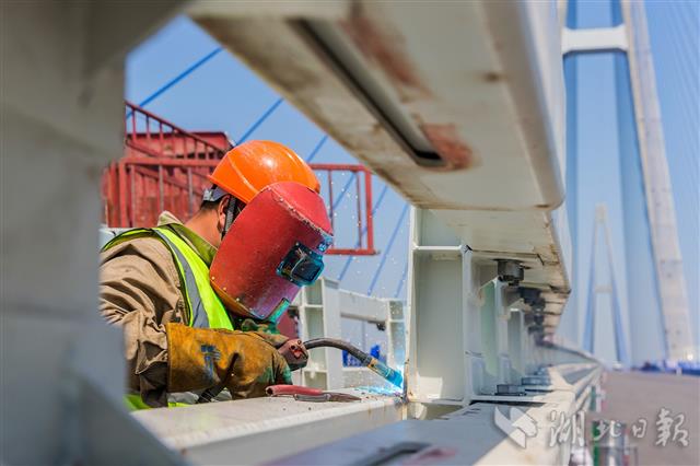 4月26日,中铁大桥局施工人员正在对大桥中心隔离护栏进行焊接。武汉青山长江大桥于4月7日恢复施工以来,现场作业人员达240多人,全部经过核酸和血清检测后上岗。青山长江大桥是武汉第11座长江大桥,目前主体工程已完工,正进行景观亮化、交安机电等工程施工,项目施工方紧抓防疫、安全生产不放松,尽最大努力把因疫情影响的工期抢回来。该大桥预计年底将通车。(湖北日报全媒记者 梅涛 通讯员 马文建 摄)