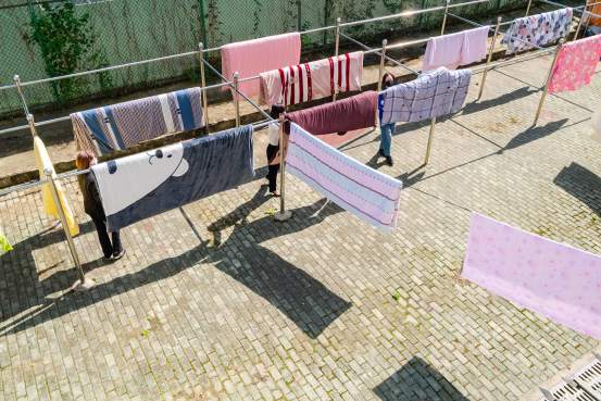 考虑到很多学生不希望在没有经过自己同意的情况下被碰触私人物品,因此各个宿舍楼栋的宿管员首先通过微信群或QQ群与同学们进行沟通。征询了大家的同意后,宿管员把同学们的被褥等床上用品拿到宿舍楼下的晒衣绳上晾晒。