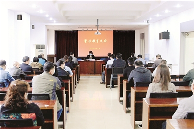 4月27日,天津市河西区天塔街道党工委就天塔街道原党工委委员、办事处副主任彭太刚等人在扫黑除恶专项斗争中不作为、不负责问题召开警示教育大会,用身边事教育身边人,汲取教训、举一反三、引以为戒。黄起盛 摄