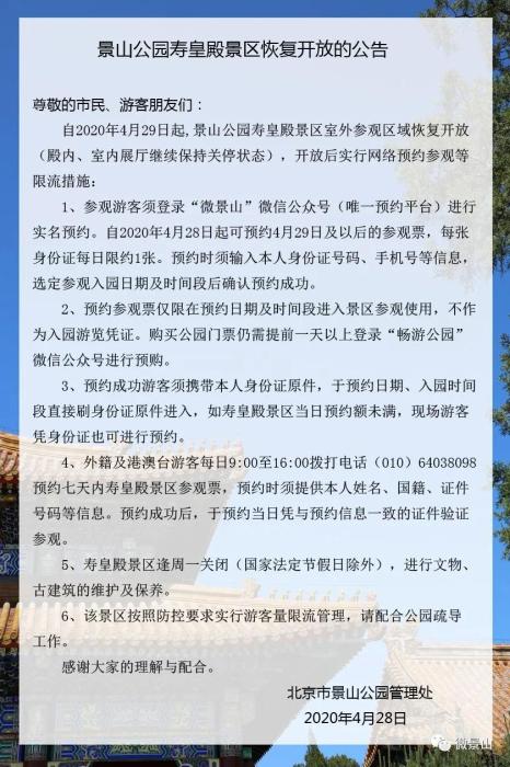 景山公园宣布,4月29日起,景山公园寿皇殿景区室外参观区域恢复开放(殿内、室内展厅继续保持关停状态),开放后实行网络预约参观等限流措施。