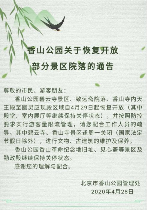 28日,香山公园公告称,碧云寺景区、致远斋院落、香山寺内天王殿至圆灵应现殿区域自4月29日起恢复开放(其中殿堂、室内展厅等继续保持关停状态),并按照防控要求实行游客量限流管理。