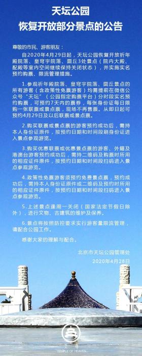 天坛公园公告显示,自4月29日起,恢复开放祈年殿院落、皇穹宇院落、圜丘3处景点(院内大殿、配殿等室内空间继续保持关闭状态),并实施实名预约购票、限流管理措施。