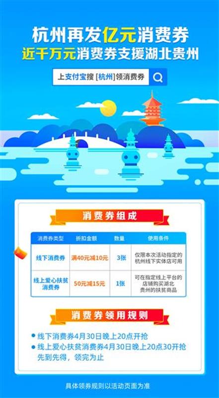 4月30日晚上20点起,杭州消费者可从支付宝首页专区入口或搜索“杭州”参与领券活动。线下消费券20点开始领取,线上爱心扶贫消费券20点30分开始领取。