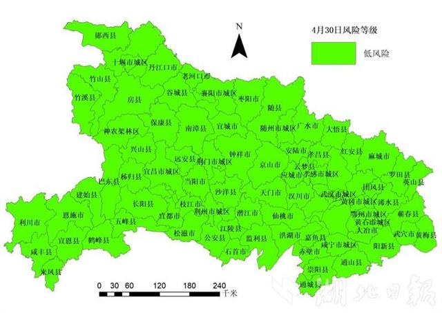 依据国务院应对新型冠状病毒感染肺炎疫情联防联控机制《关于科学防治精准施策分区分级做好新冠肺炎疫情防控工作的指导意见》中的风险划定标准,经省疾控中心组织专家评估,截至4月30日24时,全省低风险市县76个,无中、高风险市县。武汉市13个城区均为低风险区,无中、高风险区。
