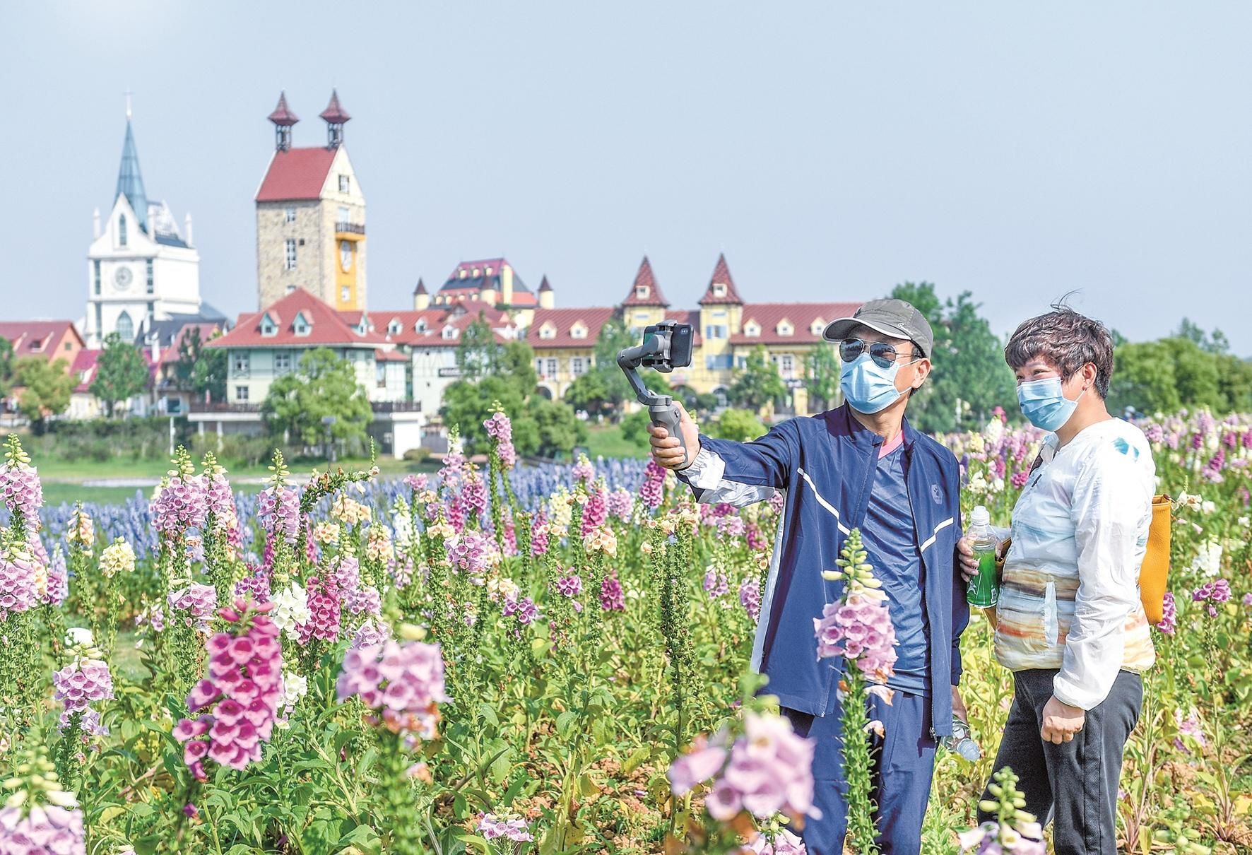 “这紫色的花儿好大一片,真漂亮,来合个影。”在成片的马鞭草旁,朱振芳和蒋受林多次合影拍照,脸上的笑容虽然隔着口罩,也是表露无遗。