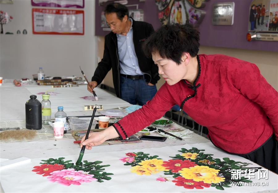 洛阳市孟津县平乐村农民画家徐均霞(右)在创作牡丹画(4月27日摄)。 新华社记者 朱祥 摄